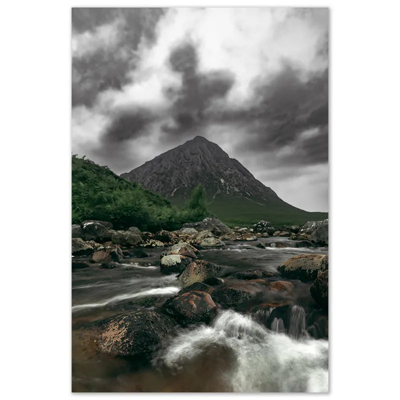 Dieses atemberaubende Foto fängt die majestätische Präsenz des Buachaille Etive Mòr ein, einem der ikonischsten Berge Schottlands. Der markante Gipfel erhebt sich imposant über dem grünen Tal, während sich der River Coupall durch die Landschaft schlängelt. Dramatische Wolkenformationen am Himmel verleihen der Szene eine mystische Atmosphäre.